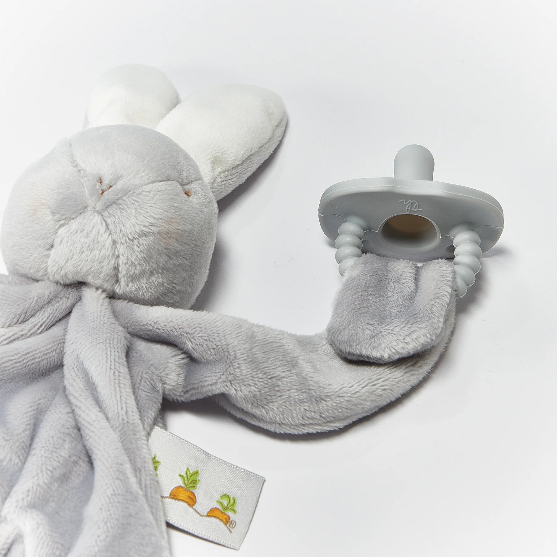 Bloom Bunny Silly Buddy animal pacifier holder is the perfect gift for your wee one with multiple ways to soothe. Luscious glacier gray, super-soft and floppy, super silly, and oh so useful, this take-a-long pal will tie onto baby's stroller, crib or car seat.