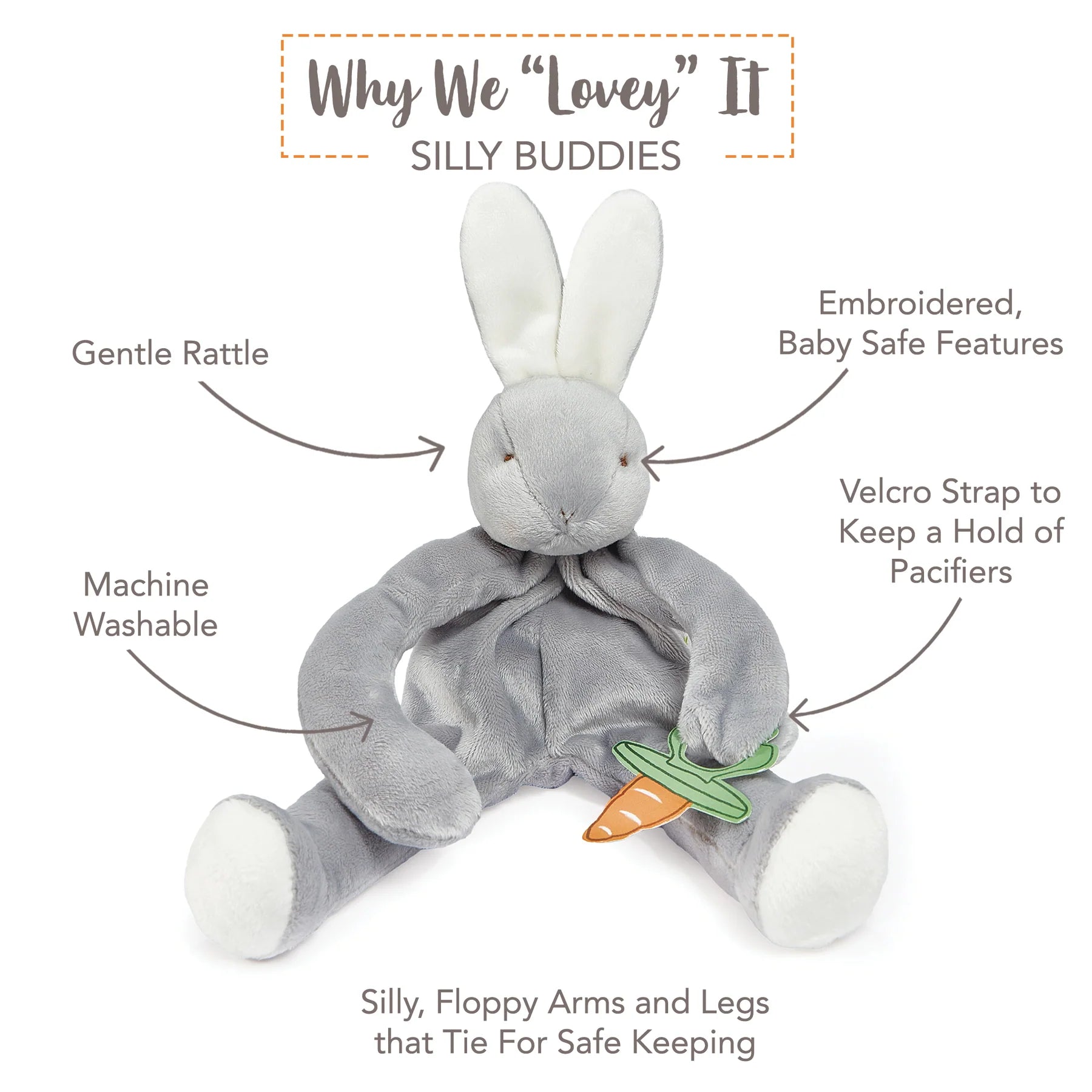 With pacifier holder hand loop and fun rattling head, this is sure to be a favorite security item for baby and Mom and Dad alike! Signature three carrot tag for little one's fingers.