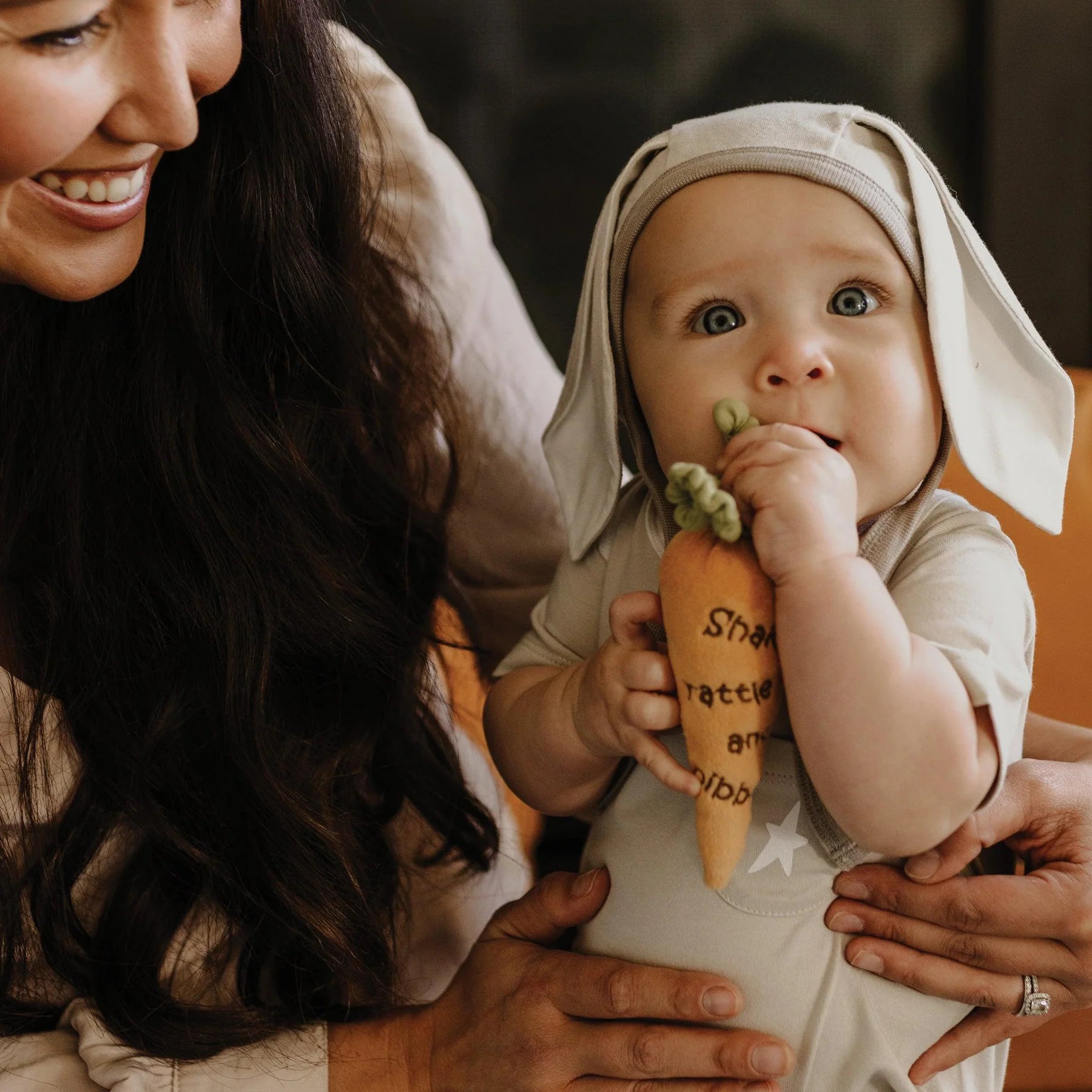 This adorable little veggie rattle has "Shake rattle and nibble" embroidery on our vibrant orange velour carrot with crinkly green leaves. It's not only cute but helps with tactile and sensory development. The perfect way to entertain your little bunny!
