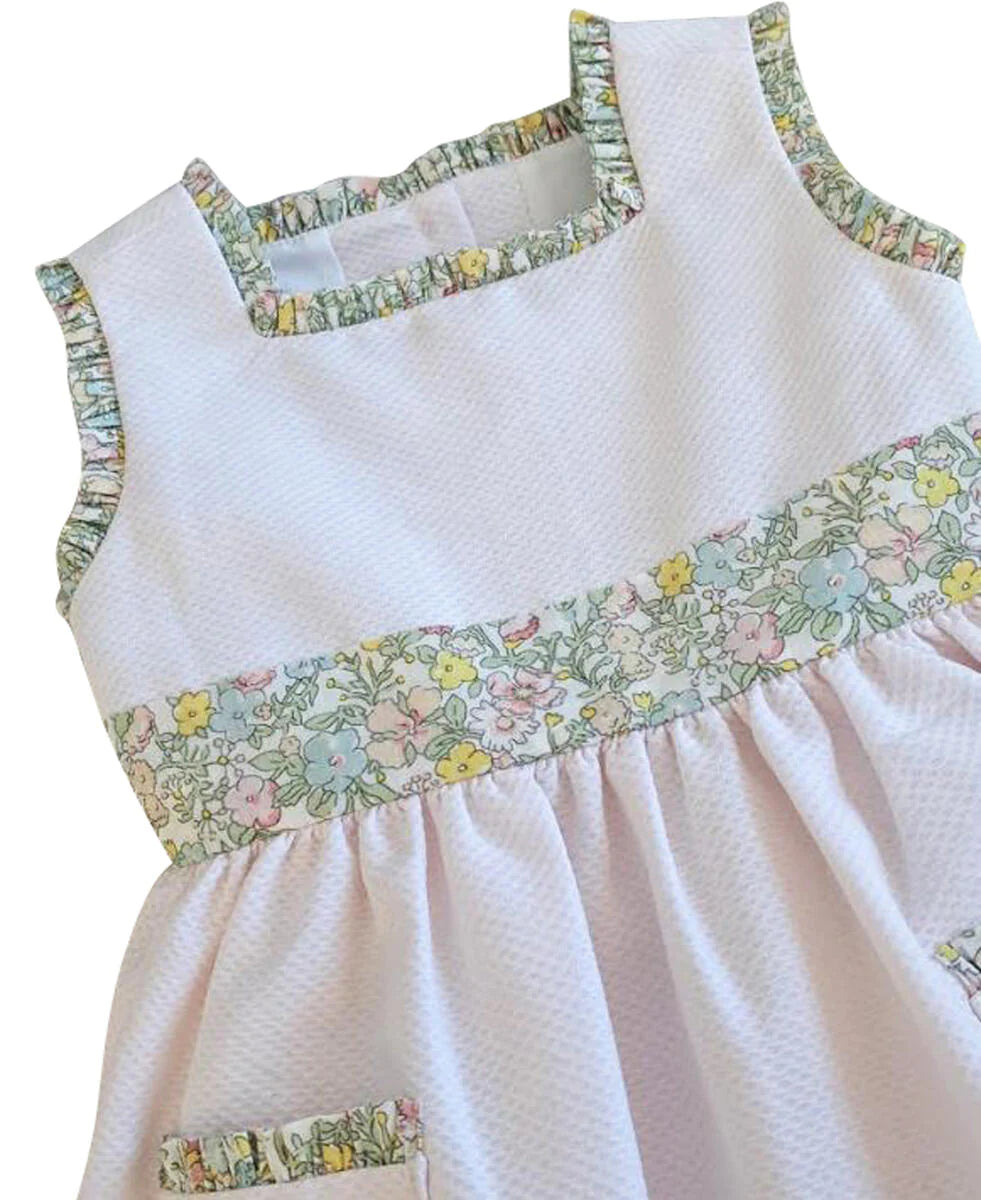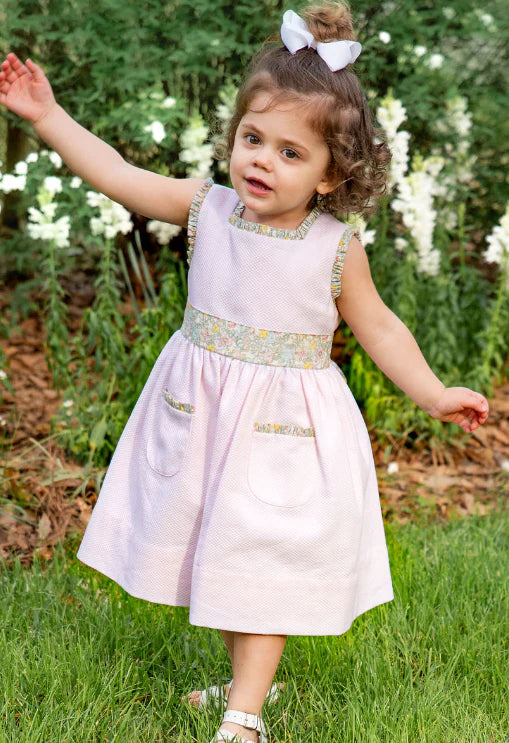 Pink pique with floral trim. Pockets on the front. Fully lined. Tie on back for bow.