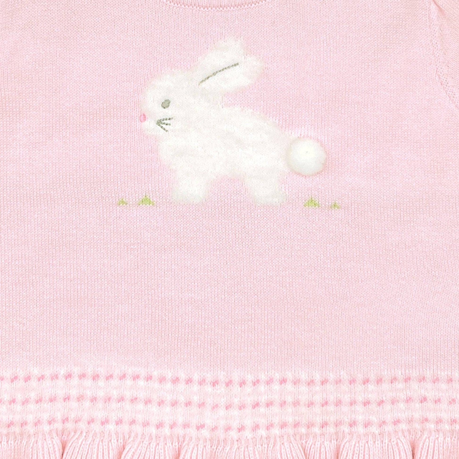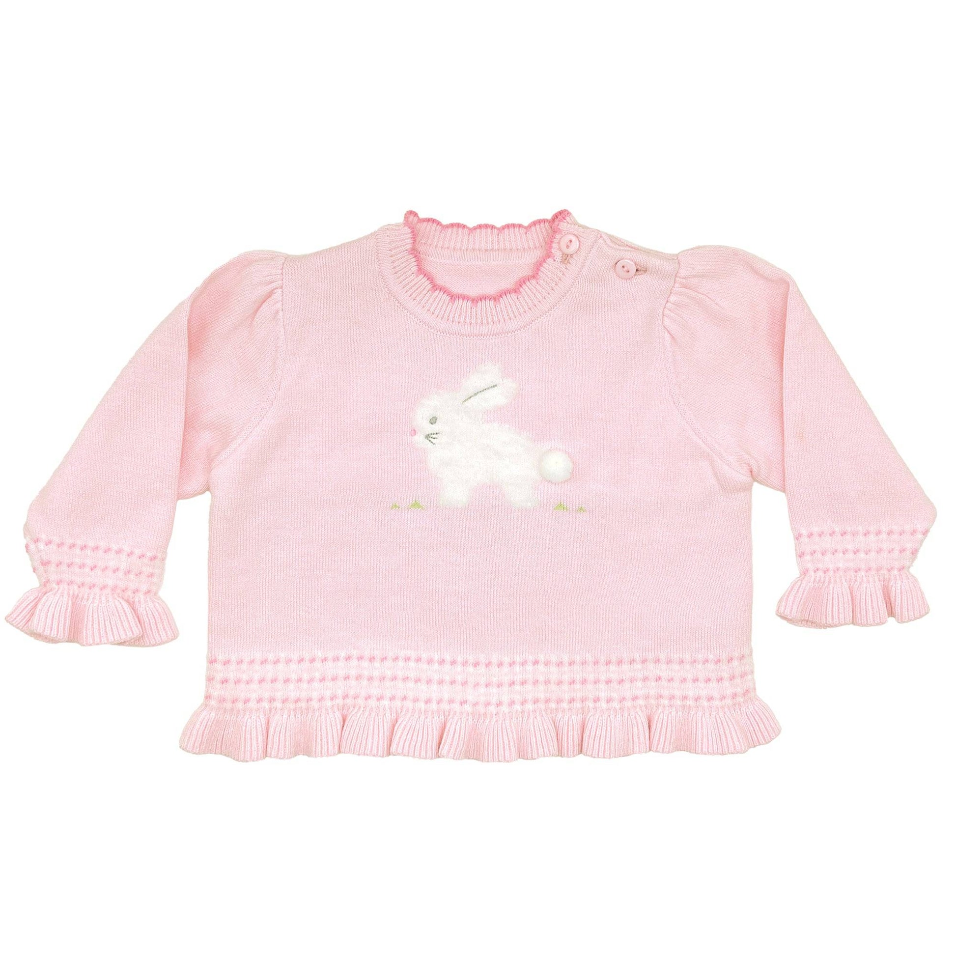 This fine gauge fuzzy bunny knit sweater is made using all natural 100% cotton yarns and eco-friendly dyes making a soft and elegant sweater that any child is sure to love. Our lightweight knit sweater features jacquard fuzzy bunny with a puff ball tail on the front with jacquard patterned trim and is machine washable for easy care!